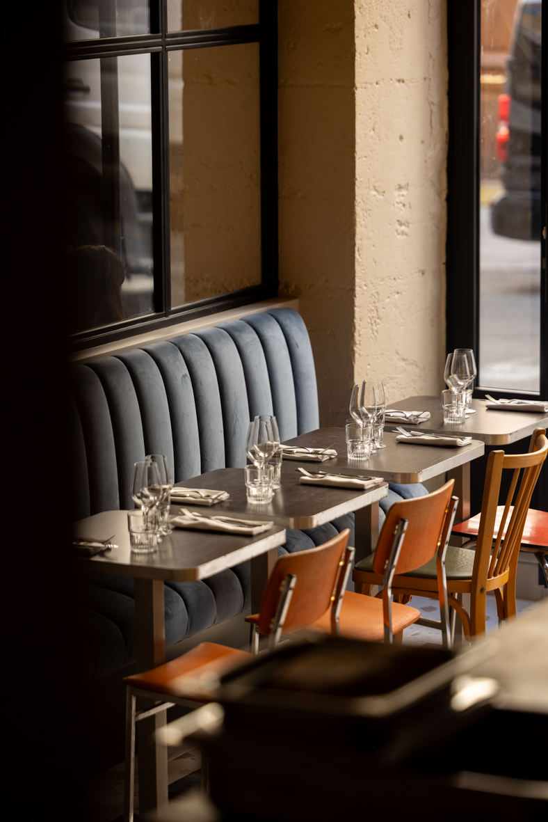 Du logo à l’enseigne rétro-éclairée, des banquettes en velours bleu aux miroirs muraux, chaque détail a été pensé sur mesure en dialogue avec le chef Rémi Lazurowicz, afin de faire du Comptoir LAZU un lieu de vie à la fois populaire, joyeux et singulier.