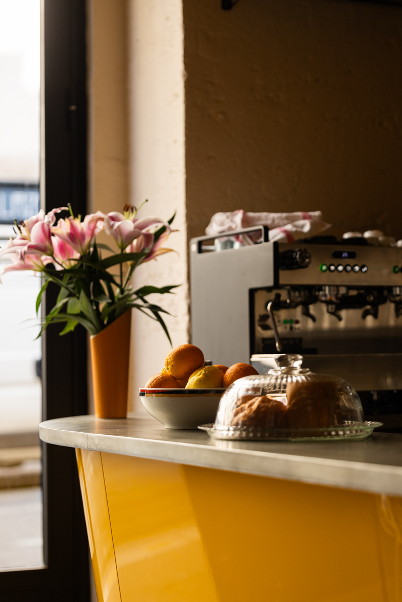 Pièce centrale du projet, le comptoir en zinc véritable s’impose avec ses courbes généreuses jaune vif et son éclat métallique. Conçu comme un objet monolithique, il devient le cœur du lieu, catalyseur de rencontres et de convivialité.